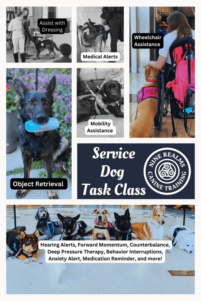 Handlers will focus on all skills and information needed to be independent and professional service dog teams first and foremost. If there is time and dogs are progressing nicely, handlers will be offered opportunities to test for all three levels of Canine Good Citizen and the Nine Realms Public Access Test. However, these tests do not make a service dog a service dog and thus the focus of the class will be on training professional service dogs that accurately task.