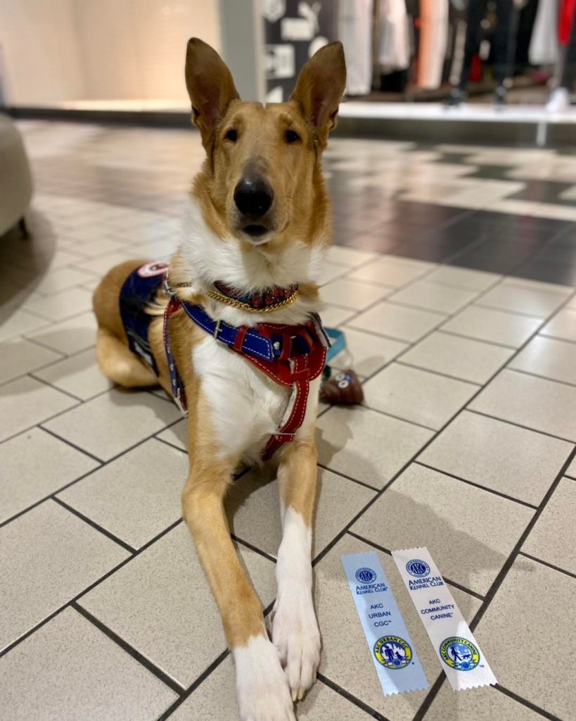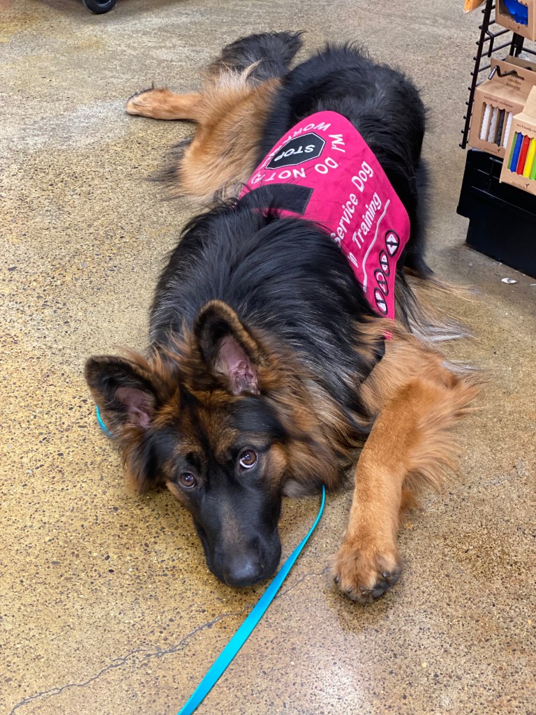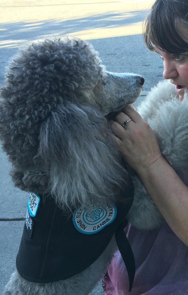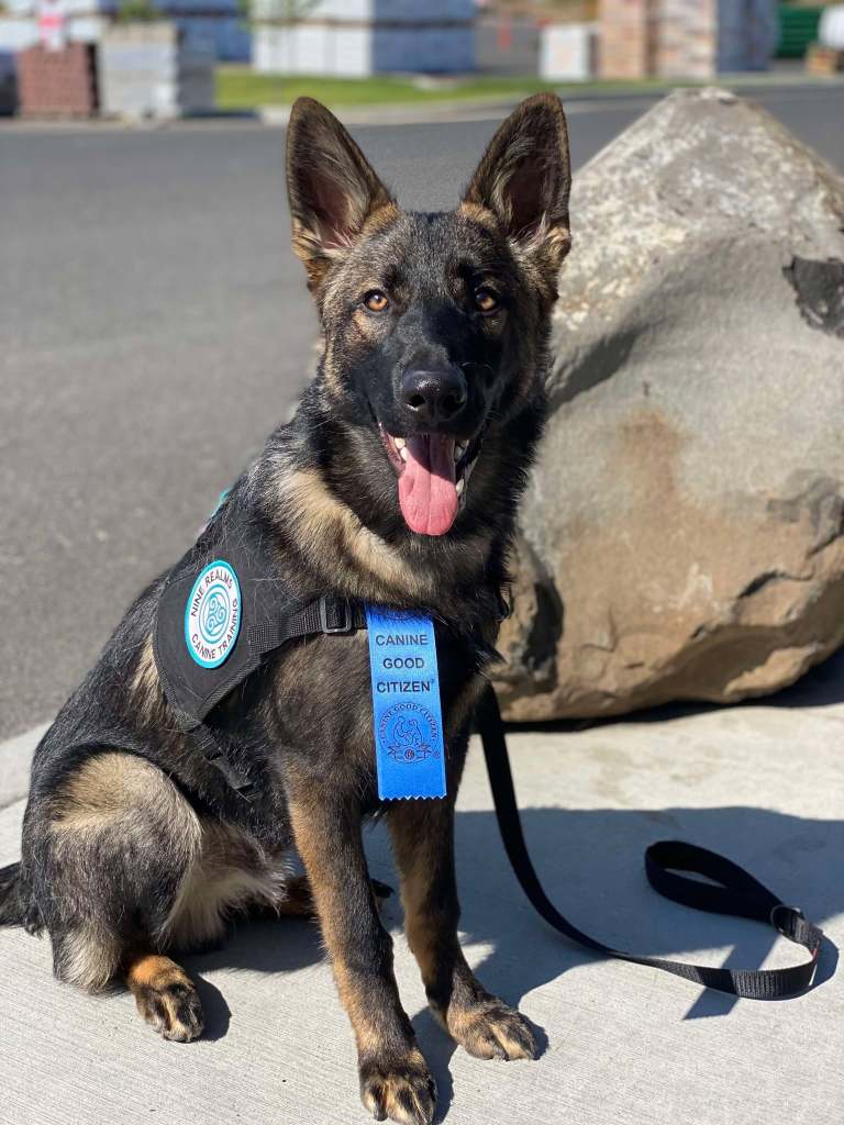 Training starts in the home or pet friendly locations, working on obedience and tasks, and then moves to public access training, with permission from several locations. Handlers and dogs meet with Karin and train several times a month, working on obedience, tasks, and public access until the dog is a fully trained service dog. All dogs must pass all three Canine Good Citizen Tests, the Nine Realms’ Public Access Test, a Task Proficiency Test, and then are certified through the American Society of Canine Trainers (if handlers want this final component). This ensures that the dogs leaving the program are highly trained, prepared, and skilled for their future careers. Please note that certification is not required per ADA law for Service Dogs, as well as the CGC tests. Nine Realms holds its handlers and dogs to higher levels of standards and thus requires each team to meet these standards before passing the program.