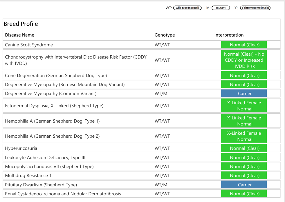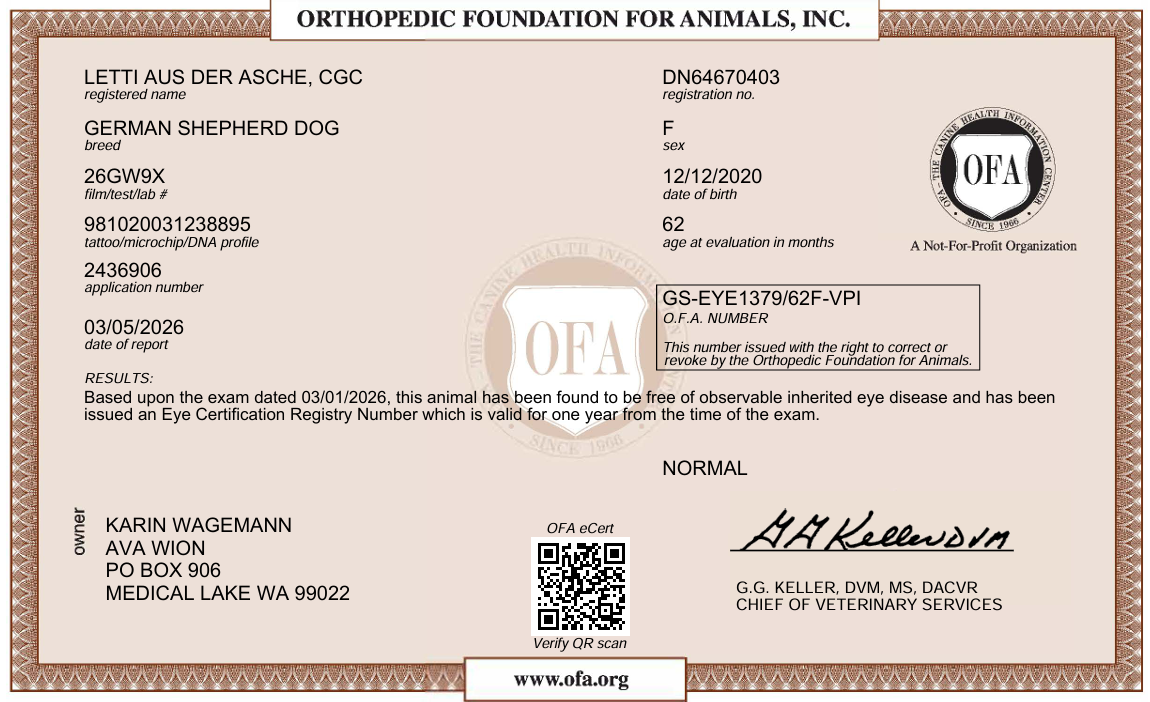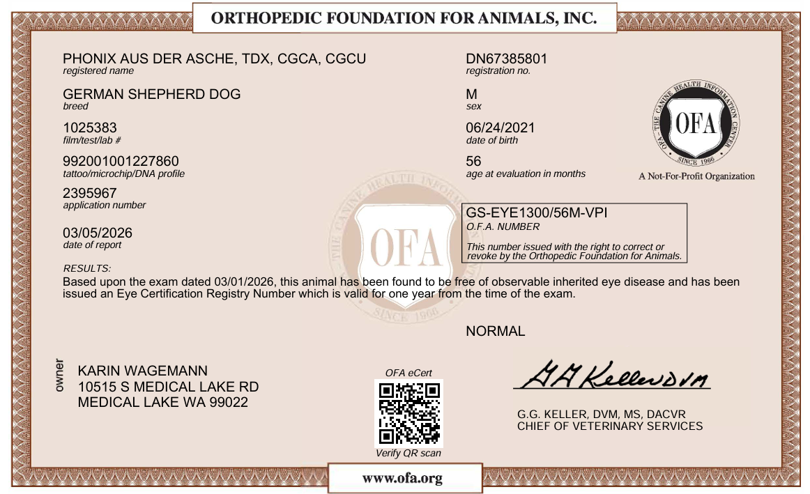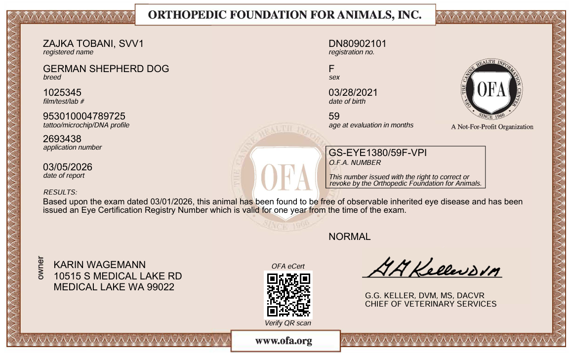 OFA Good Hips, DM N/N, SV Elbows A Stamp Noch Zugelassen, OFA Eyes Clear, AKC Health Test Clear
